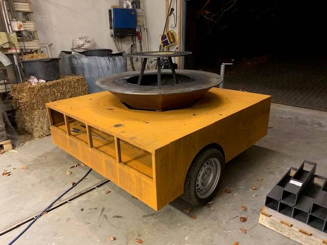 Aan de voorzijde zit een houtopslag van 1M3 en aan de achterzijde kunnen de borden en het bestek neer gezet worden.